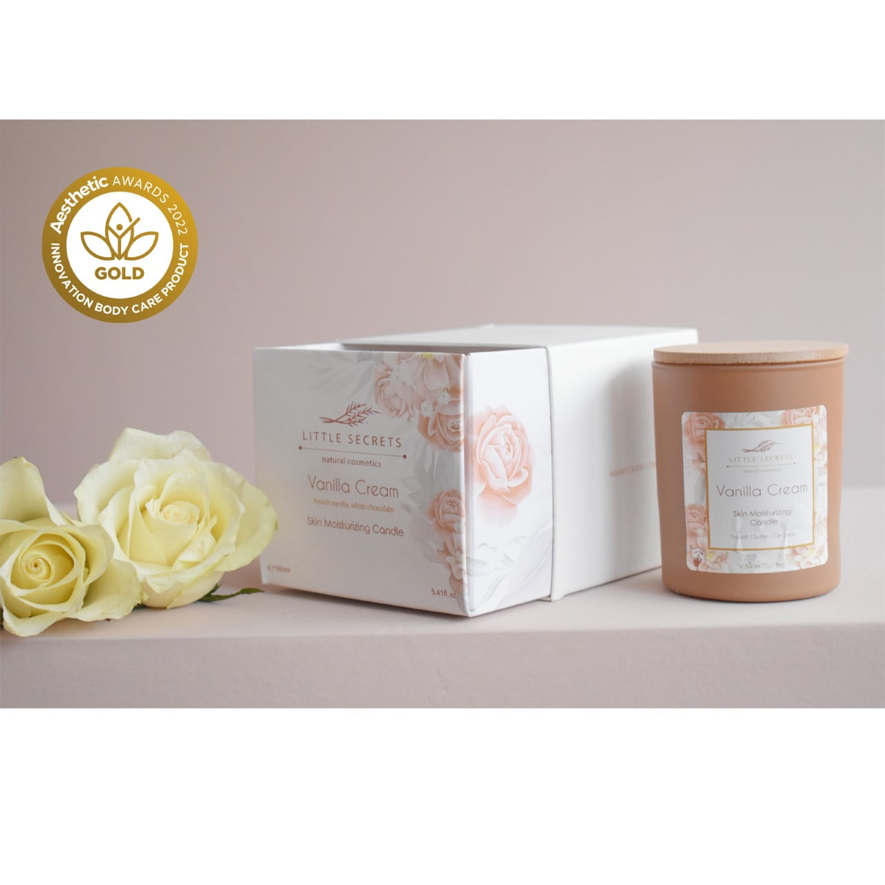 Το Vanilla Cream Skin Moisturizing Candle περιέχει ένα μαγευτικό συνδυασμό αρωμάτων νότες γαλλικής βανίλιας και λευκής σοκολάτας.Είναι ένα καινοτόμο ενυδατικό κερί από μείγμα 4 ευεργετικών ελαίων που ενώ λιώνουν δημιουργούν μία μοναδική αίσθηση ενυδάτωσης, ευεξίας και αποτοξίνωσης στο δέρμα.Εμπλουτισμένο με λάδι αμυγδάλου, λάδι καρύδας, καστορέλαιο και σησαμέλαιο με βιταμίνες Α, Ε, Β1, D. Ιδανικό για μαλάξεις και ενυδάτωση σε αφυδατωμένα σημεία του σώματος, όπως φτέρνες και αγκώνες!100% φυσικό κερί το οποίο μπορεί να χρησιμοποιηθεί σε οποιαδήποτε μορφή μασάζ, για αποτοξίνωση, βαθιά ενυδάτωση, θρέψη και χαλάρωση.Τα κεριά της LITTLE SECRETS λιώνουν αργά σε χαμηλή θερμοκρασία, απελευθερώνοντας τις βιταμίνες και τα στοιχεία των πολύτιμων ελαίων που περιέχουν και μετατρέπονται σε ένα ζεστό και πολυτελές λάδι μασάζ. |